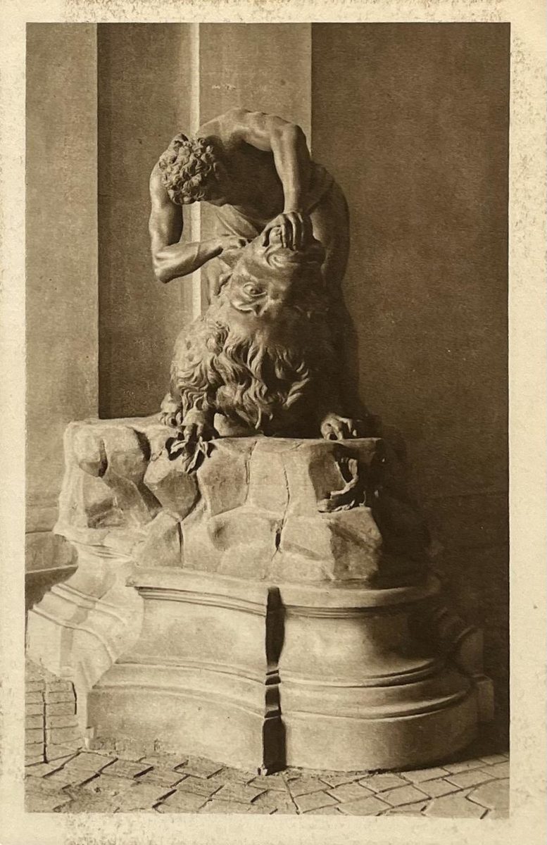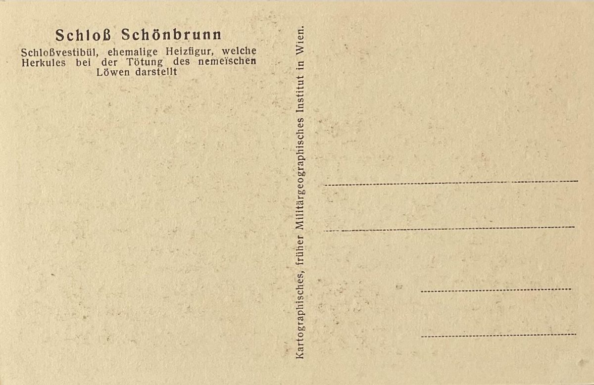 Escultura en el vestíbulo del palacio que representa la escena en la que Hércules mata al león de Nemea.Palacio de Schönbrunn. Colección Instituto geográfico de Viena.Color: sepia, medidas: 9x14cm