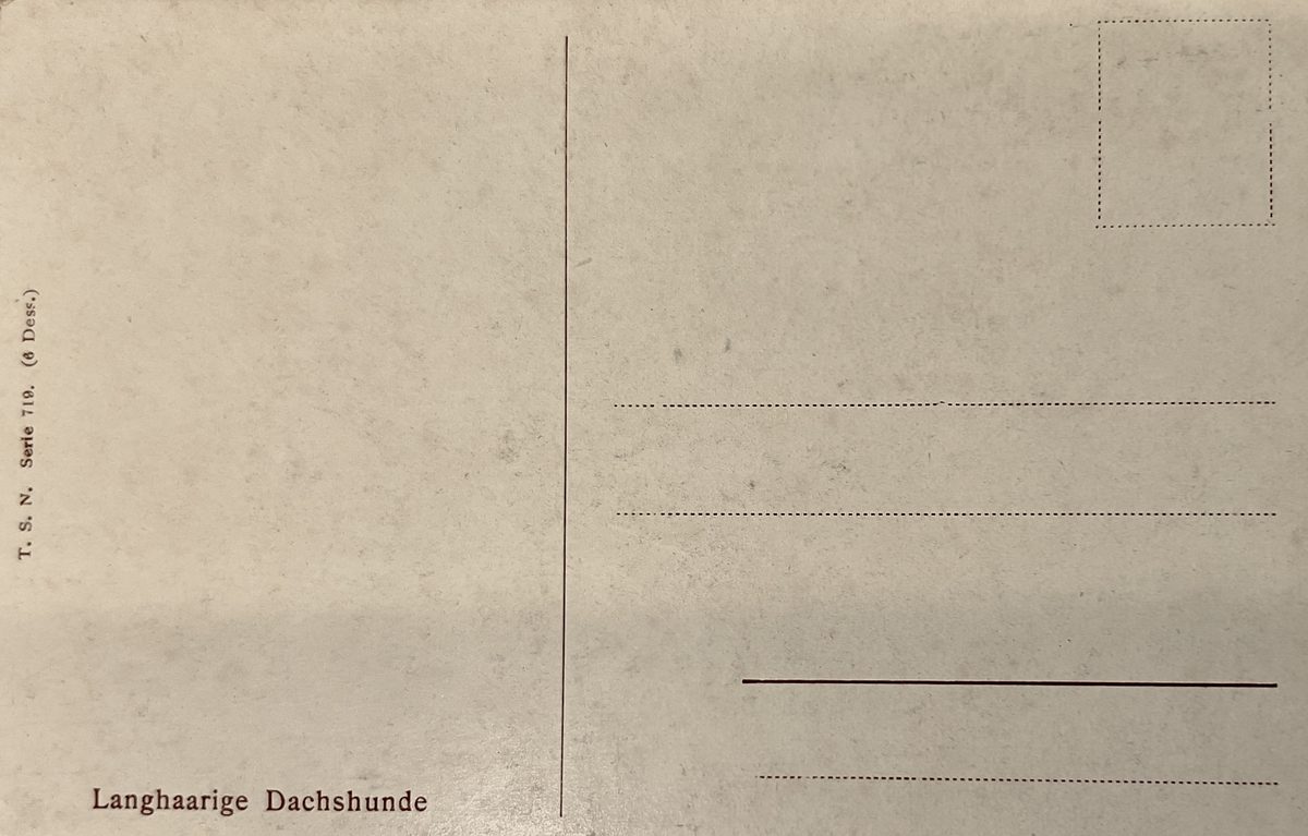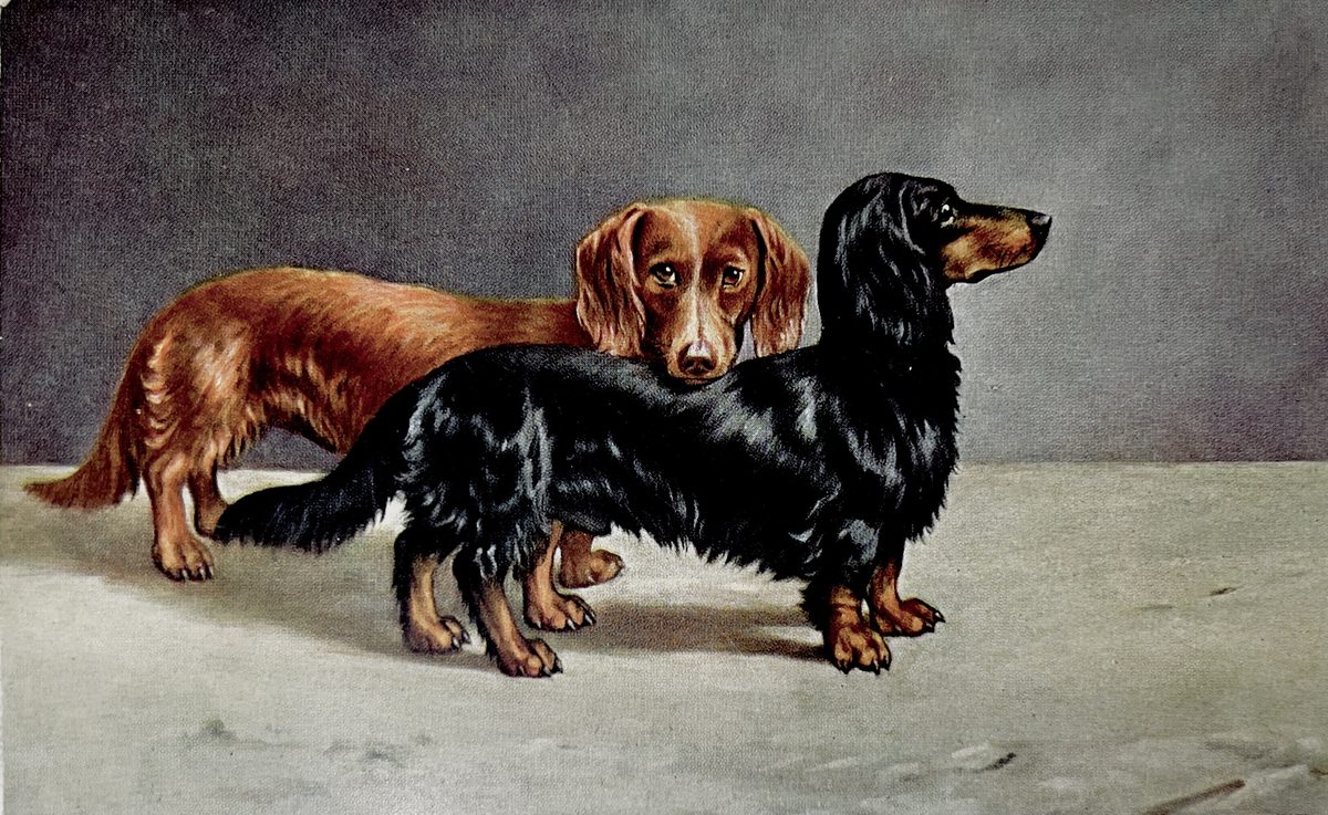 Teckels de pelo largo YearAño 1911 PlaceLugar Frankfurt, Alemania ↗ LanguageIdioma German Alemán Ilustración a color de un par de perros raza Dachshund Teckel negroteckel café Dominant colourColor dominante ← Back to collection← Volver a la colección View on map →Ver en el mapa →