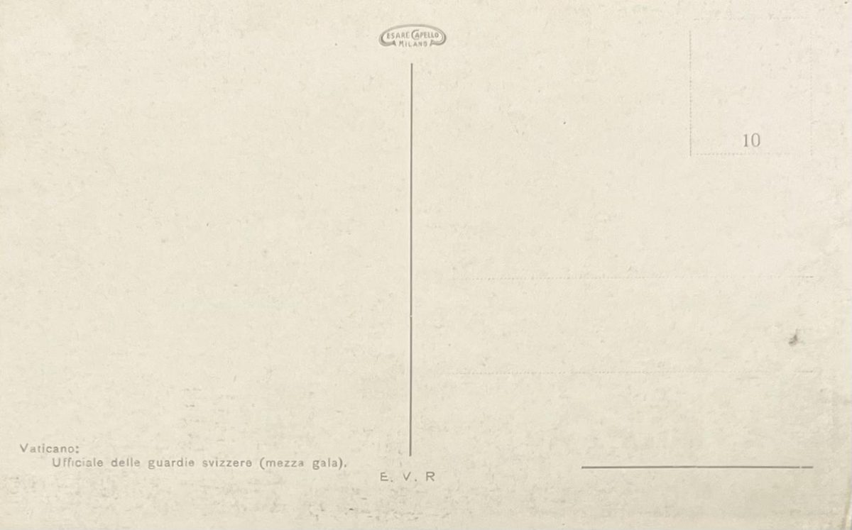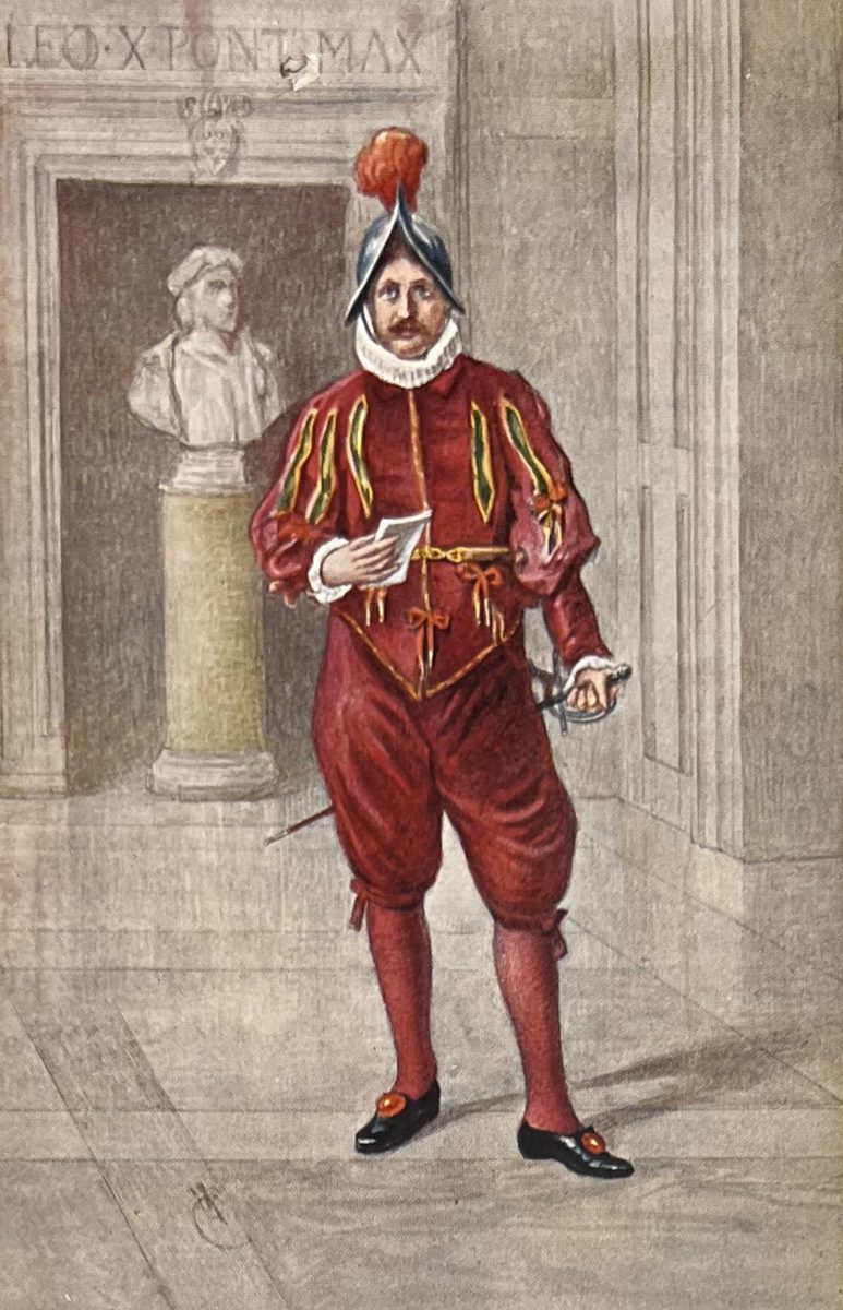 Oficial de la guardia suiza en media gala YearAño 1912 PlaceLugar Ciudad del Vaticano ↗ LanguageIdioma Italian Italiano Ilustración a color de un oficial de la guardia suiza en media gala Persona Dominant colourColor dominante ← Back to collection← Volver a la colección View on map →Ver en el mapa →