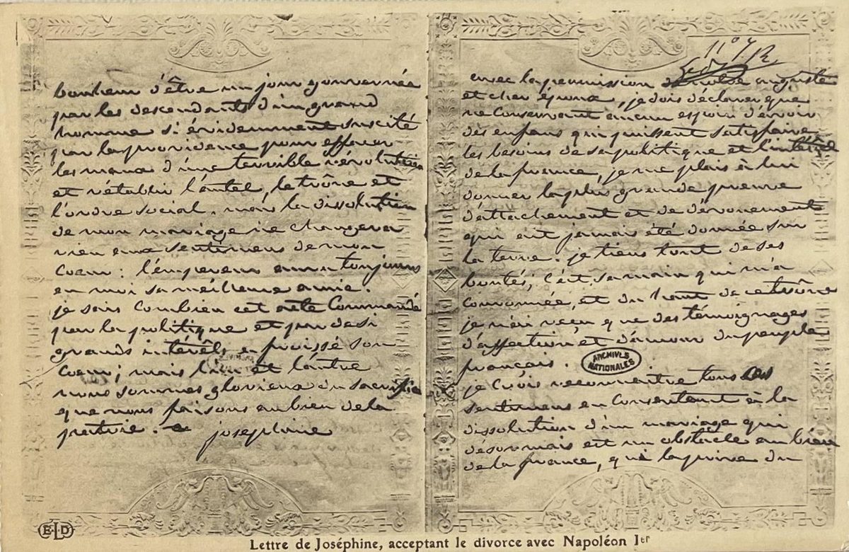 Lettre de Josephine,divorce YearAño 1911 PlaceLugar Francia ↗ LanguageIdioma French Francés Carta de Josephine aceptando el divorcio de Napoleón I. Color: sepia, medidas: 9x14cm CartaJosephineDivorcioNapoleón Dominant colourColor dominante ← Back to collection← Volver a la colección View on map →Ver en el mapa →