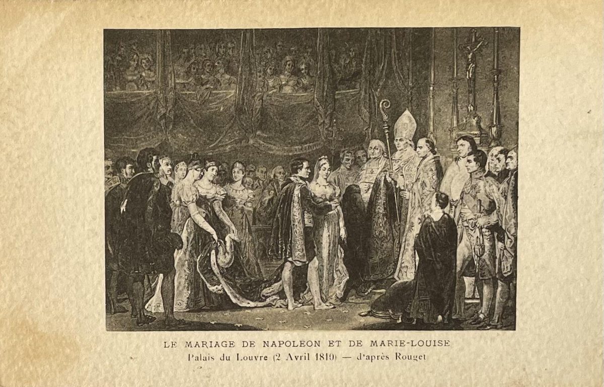 Pintura del matrimonio de Napoleón Bonaparte con la archiduquesa María Luisa de Austria en el palacio de Louvre el 2 de abril de 1810 según a como lo describió el militar Rouget. Color: sepia, medidas: 9x14cm