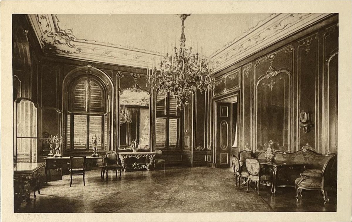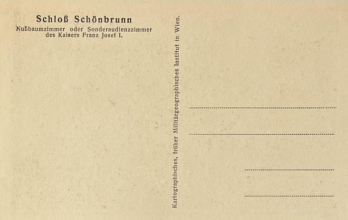 El salón de audiencias o tambien conocido como Salón de Nuez por su decoración de tipo Rococó café. Es un lugar en el que Francisco José I concedía audiencias privadas a monarcas; miembros del gobierno, altos cargos militares y miembros importantes de la corte. Palacio de Schönbrunn. Colección Instituto geográfico de Viena.Color: sepia, medidas: 9x14cm