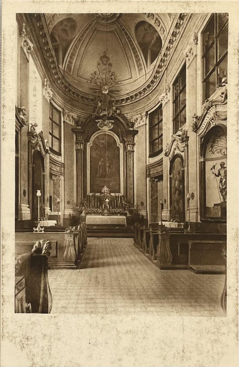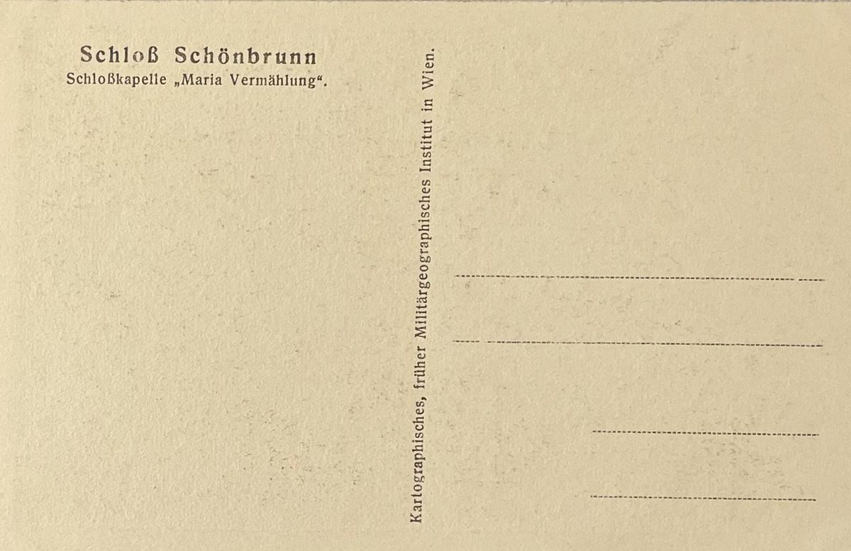Foto de vista al presbiterio de la capilla del castillo, consagrada a la "Boda de María" .Palacio de Schönbrunn. Colección Instituto geográfico de Viena.Color: sepia, medidas: 9x14cm