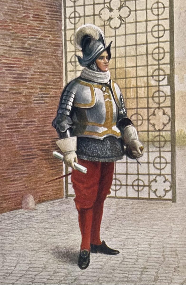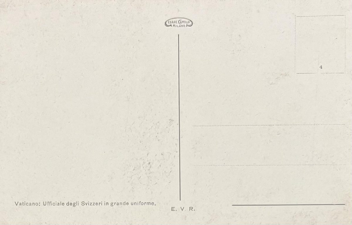 Oficial suizo en uniforme completo YearAño 1912 PlaceLugar Ciudad del Vaticano ↗ LanguageIdioma Italian Italiano Ilustración a color de un ofocial suizo de la ciudad del Vaticano vistiendo su uniforme completo Persona Dominant colourColor dominante ← Back to collection← Volver a la colección View on map →Ver en el mapa →
