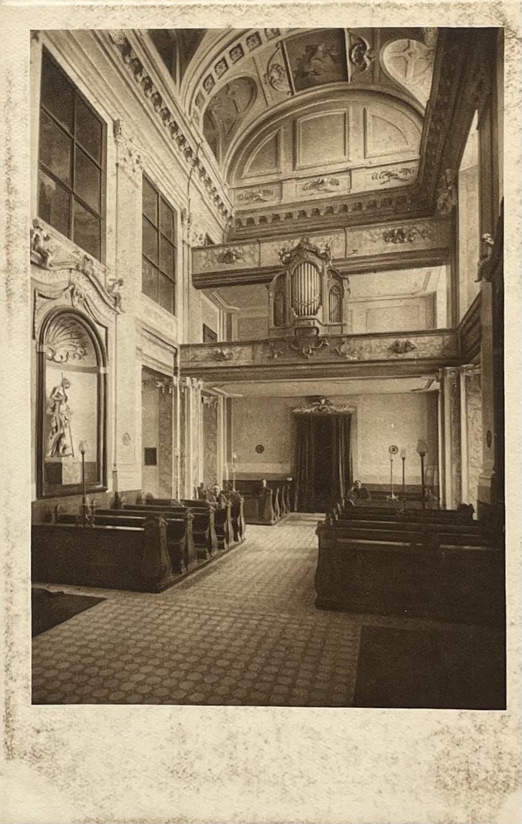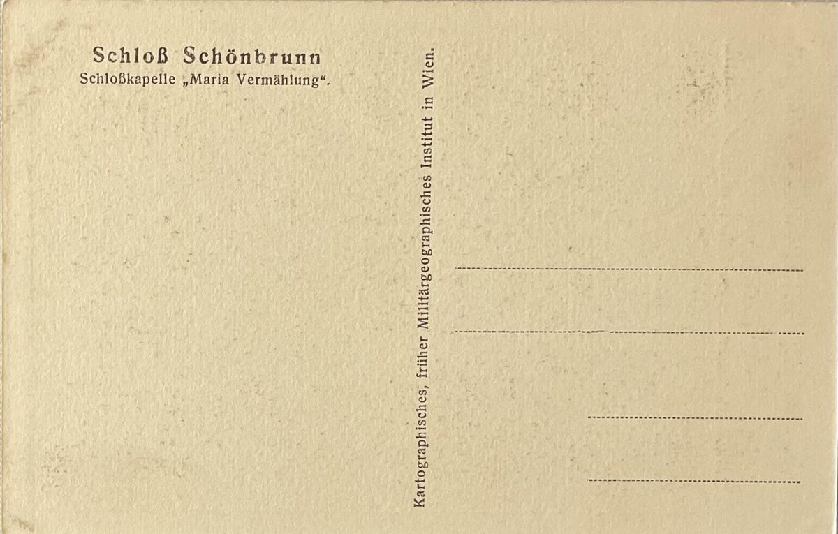 Foto de vista a la feligresía de la capilla del castillo, consagrada a la "Boda de María" .Palacio de Schönbrunn. Colección Instituto geográfico de Viena.Color: sepia, medidas: 9x14cm