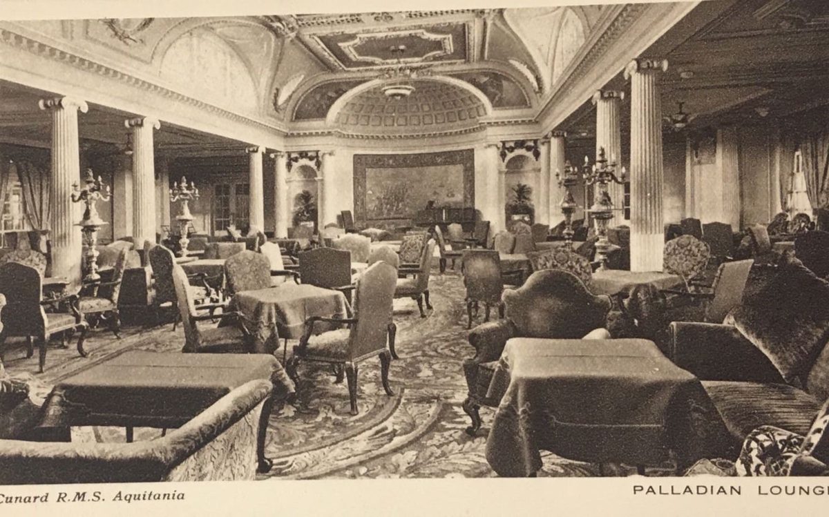 Interior del transatlántico de pasajeros 'Aquitania' (1914) que muestra el salón de primera clase, también llamado Palladian Lounge, en la cubierta Promenade (cubierta A). Esta es una vista del lado de estribor, mirando hacia las puertas dobles a través del Salón de Primera Clase (o Sala de Escritura)