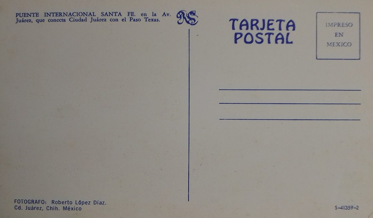 Fotografía a color del puente internacional Santa Fe en Ciudad Juárez PlaceLugar Ciudad Juárez, México ↗ LanguageIdioma Spanish Español SourceFuente Colección de postales de Manuel Campero Fotografía a color del puente internacional Santa Fe en Ciudad Juárez, México Ciudad Dominant colourColor dominante ← Back to collection← Volver a la colección View on map →Ver en el mapa →
