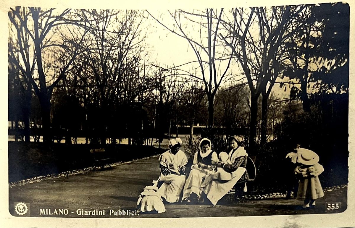 Jardin público YearAño 1912 PlaceLugar Milan, Italia ↗ LanguageIdioma Italian Italiano Fotografía en blanco y negro de un jardín público con mujeres sentadas en una banca Personas Dominant colourColor dominante ← Back to collection← Volver a la colección View on map →Ver en el mapa →