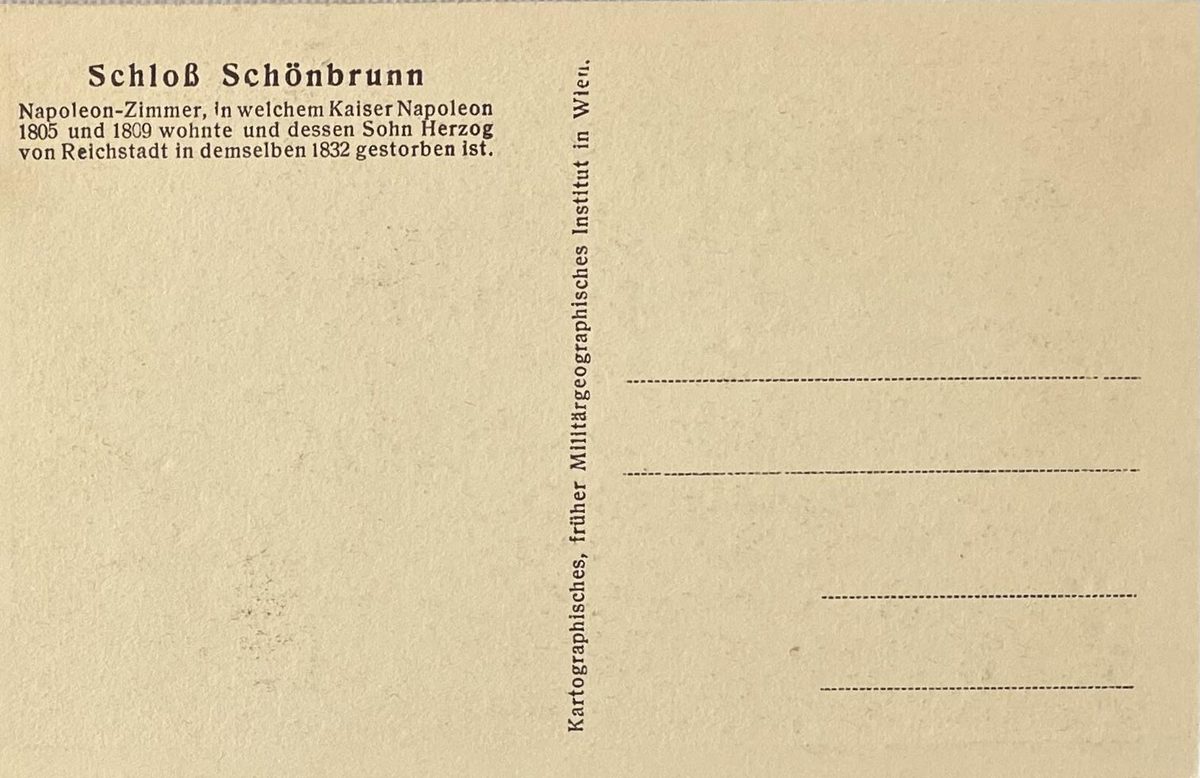 Cuarto de Napoleón donde el emperador vivió de 1805 a 1809 y donde su hijo el Duque de Reichstadt murió en 1832.Palacio de Schönbrunn. Colección Instituto geográfico de Viena.Color: sepia, medidas: 9x14cm