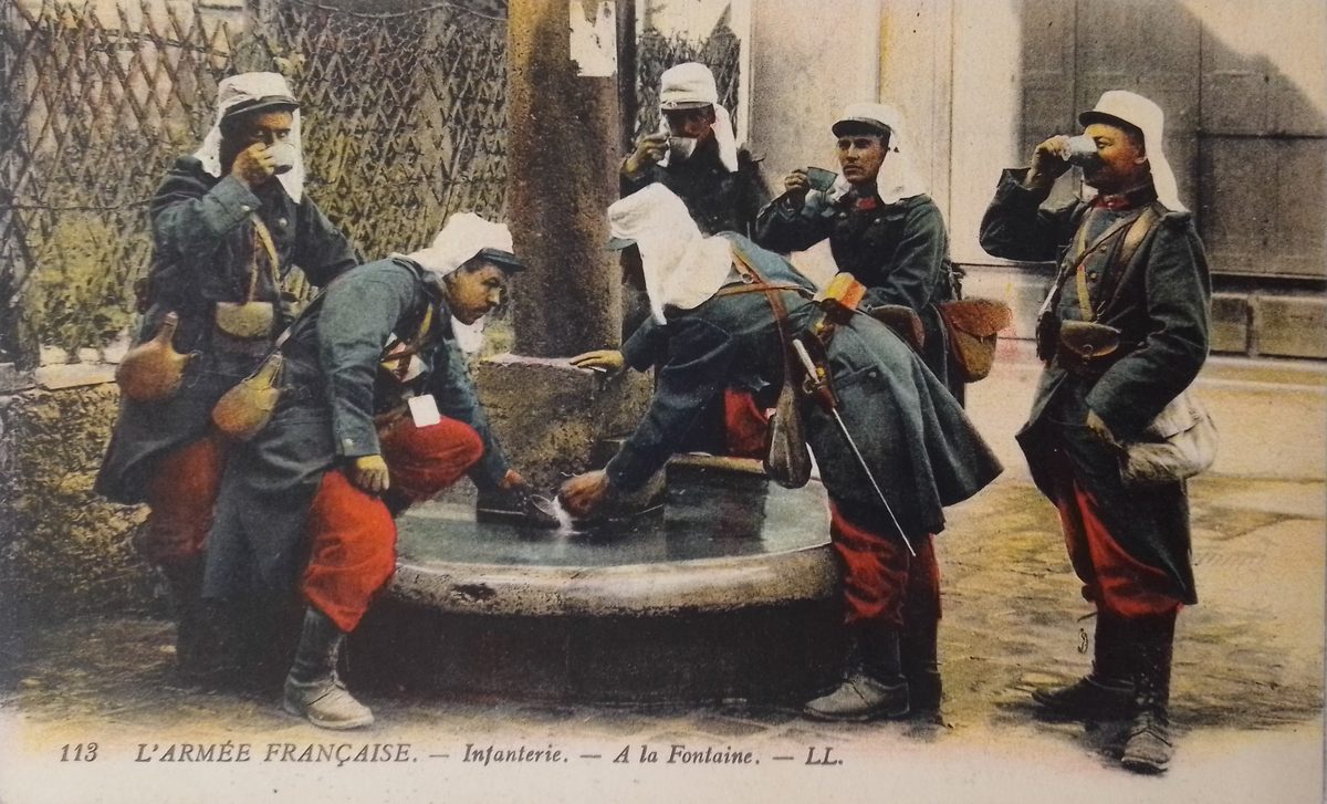 Fotografía colorizada del ejército francés en una fuente LanguageIdioma French Francés SourceFuente Colección de postales de Manuel Campero Fotografía del ejército francés bebiendo agua de una fuente Ejército Dominant colourColor dominante ← Back to collection← Volver a la colección View on map →Ver en el mapa →