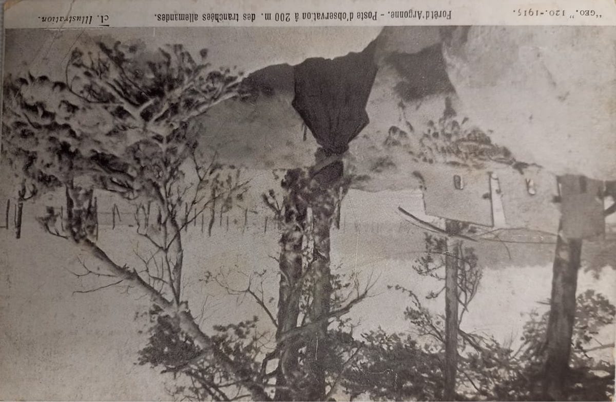 Fotografía de poste de observación de trincheras alemanas YearAño 1915 PlaceLugar Bosque de Argonne, Francia ↗ LanguageIdioma French Francés SourceFuente Colección de postales de Manuel Campero El bosque de Argonne fue un lugar de fuerte acción militar durante la Primera Guerra Mundial.. Guardia Dominant colourColor dominante ← Back to collection← Volver a la colección View on map →Ver en el mapa →