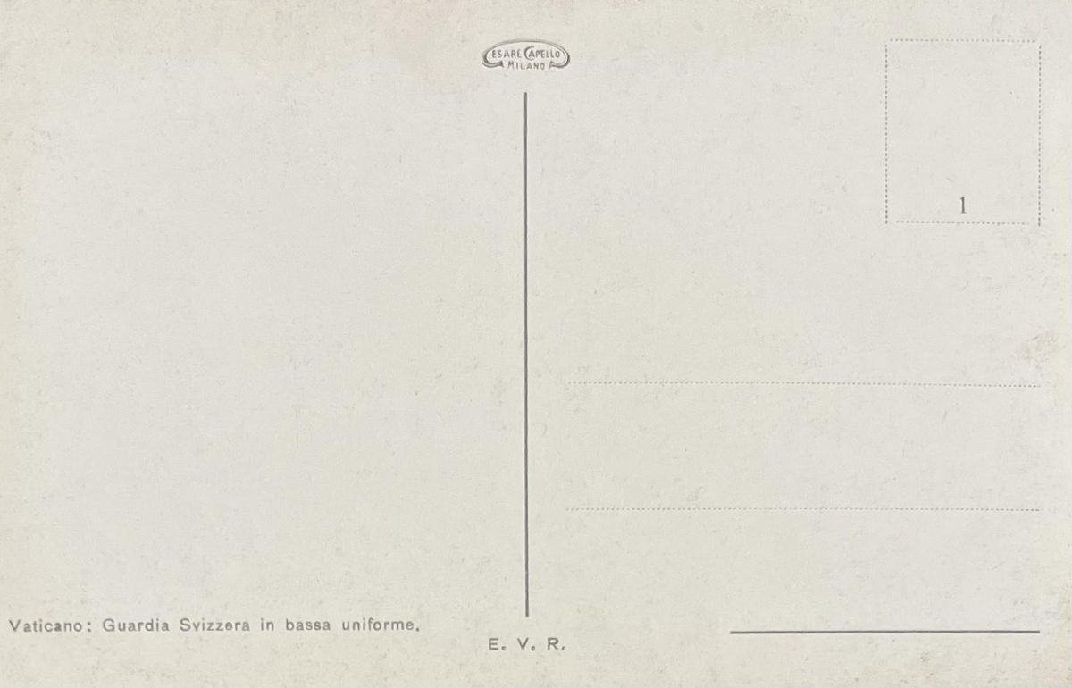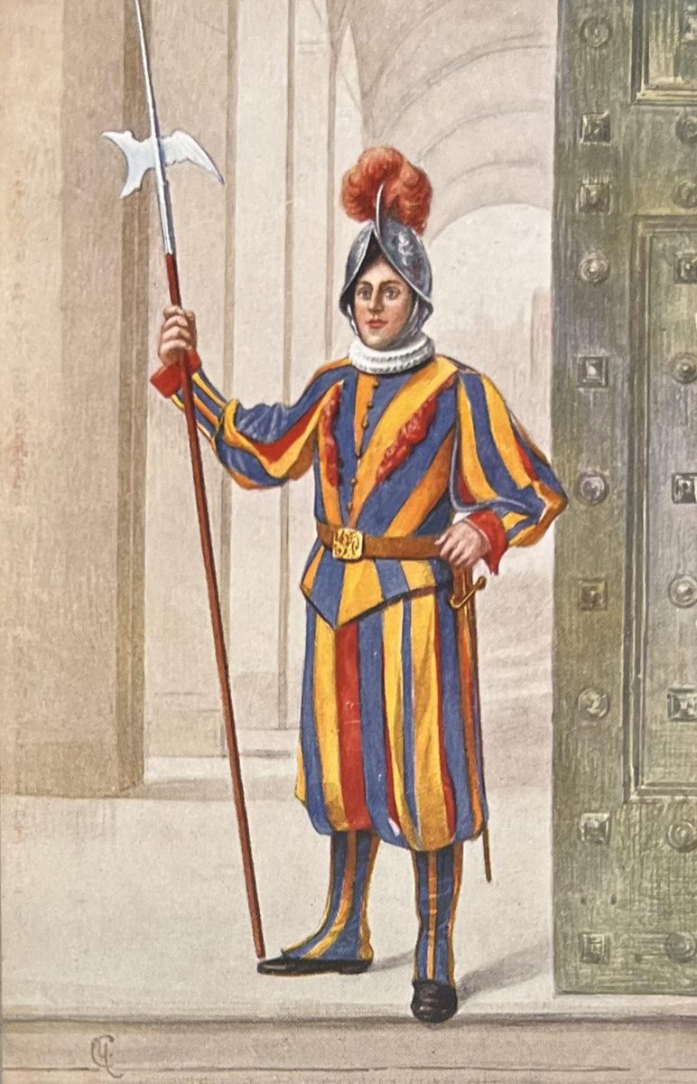 Guardia suizo en uniforme bajo YearAño 1912 PlaceLugar Ciudad del Vaticano ↗ LanguageIdioma Italian Italiano Ilustración a color de un guardia suizo de la ciudad del Vaticano vistiendo su uniforme bajo Persona Dominant colourColor dominante ← Back to collection← Volver a la colección View on map →Ver en el mapa →