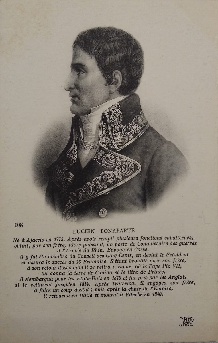 Ilustración y biografía breve de Lucien Bonaparte YearAño 1775 LanguageIdioma French Francés SourceFuente Colección de postales de Manuel Campero Ilustración y biografía breve de Lucien Bonaparte Lucien Bonaparte Dominant colourColor dominante ← Back to collection← Volver a la colección View on map →Ver en el mapa →