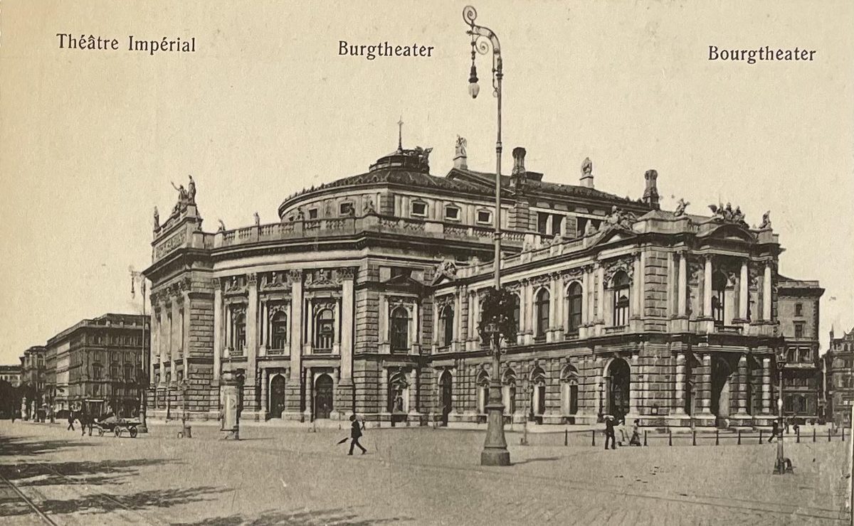 Imagen de la fachada del nuevo Teatro imperial de Viena construido en 1888, el original fue construido por orden de la emperatriz María Teresa I y su hijo el emperador José II lo llamaba el "Teatro Nacional Alemán" en 1776. Colección de la casa editorial de los Hermanos Kohn Viena 1. Color: sepia, medidas: 9x14cm