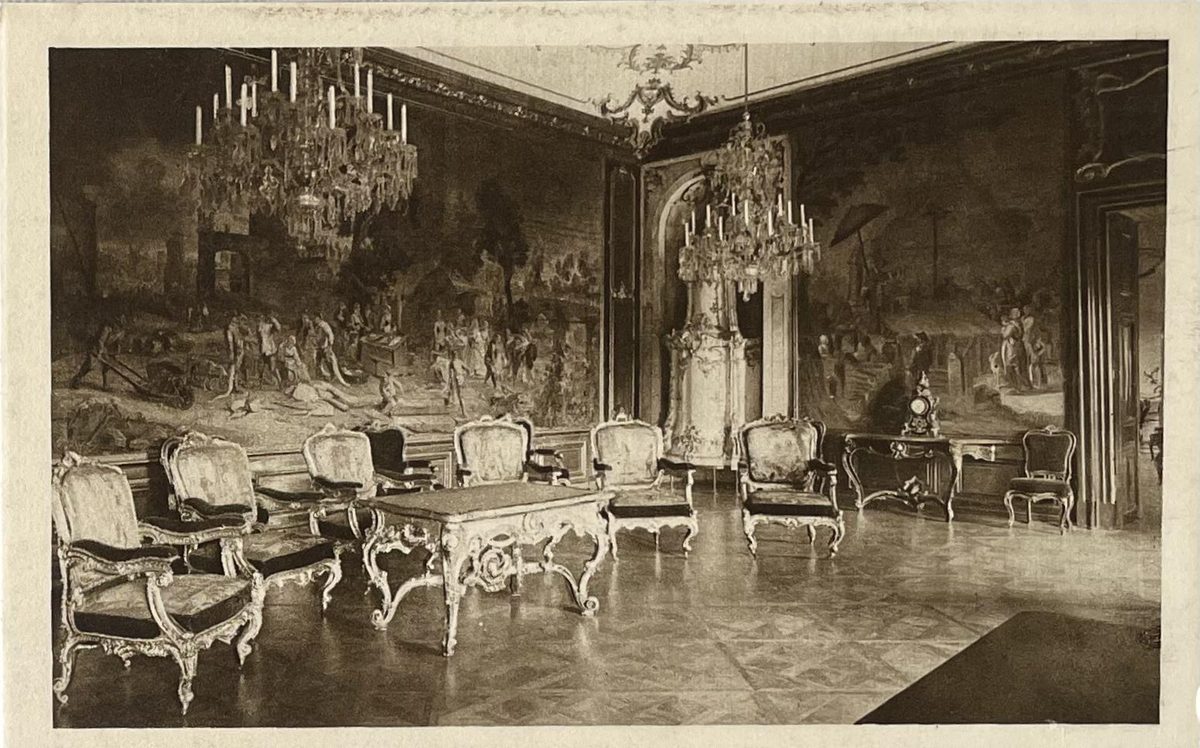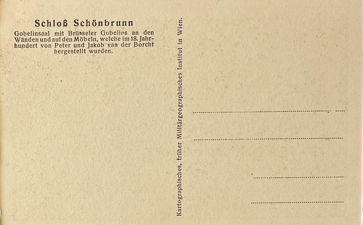 Salón Gobelin o sala de los tapices, tanto las paredes como los muebles fueron recubiertos con tapices de Bruselas, estos fueron traídos en el siglo 18, .Palacio de Schönbrunn. Colección Instituto geográfico de Viena.Color: sepia, medidas: 9x14cm