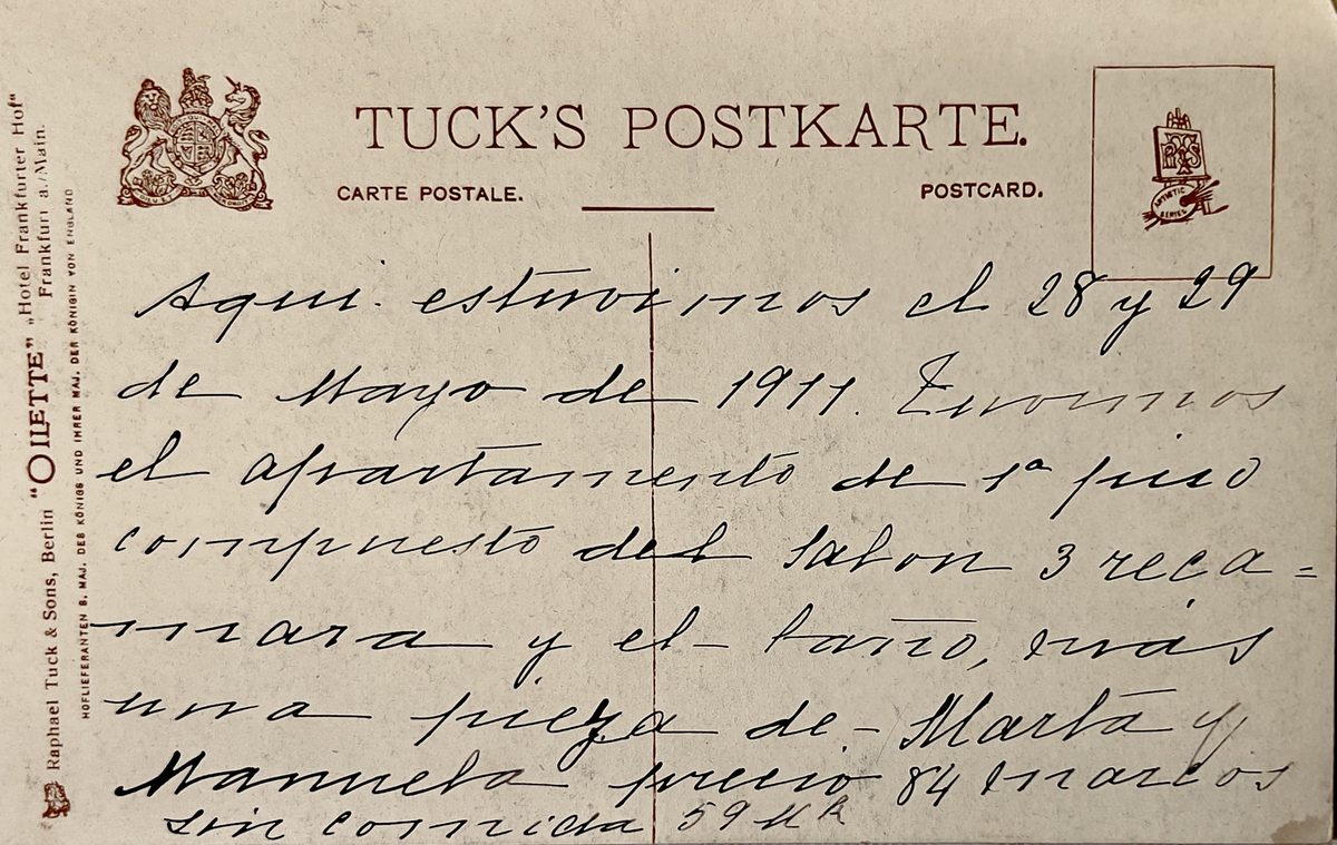 Aquí estuvimos el 28 y 29 de Mayo de 1911. Tuvimos el apartamento del 1er piso compuesto del salon, 3 recamaras y el baño, más una pieza de Marta y Manuela. Precio 84 marcos, sin comida 59 marcos.