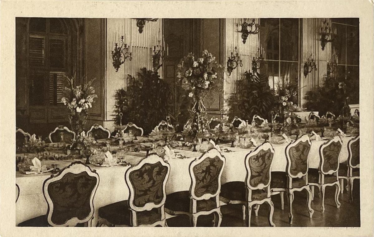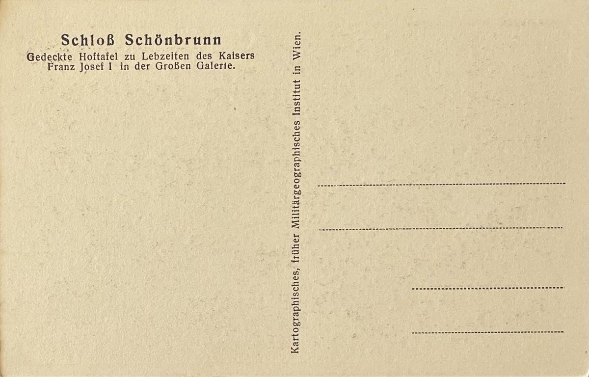 Foto de la mesa de la corte puesta desde otro angulo, correspondiente al periodo en el que el emperador Francisco José I vivió. Esta mesa se encuentra en la gran galería dentro del palacio de Schönbrunn. Colección Instituto geográfico de Viena.Color: sepia, medidas: 9x14cm