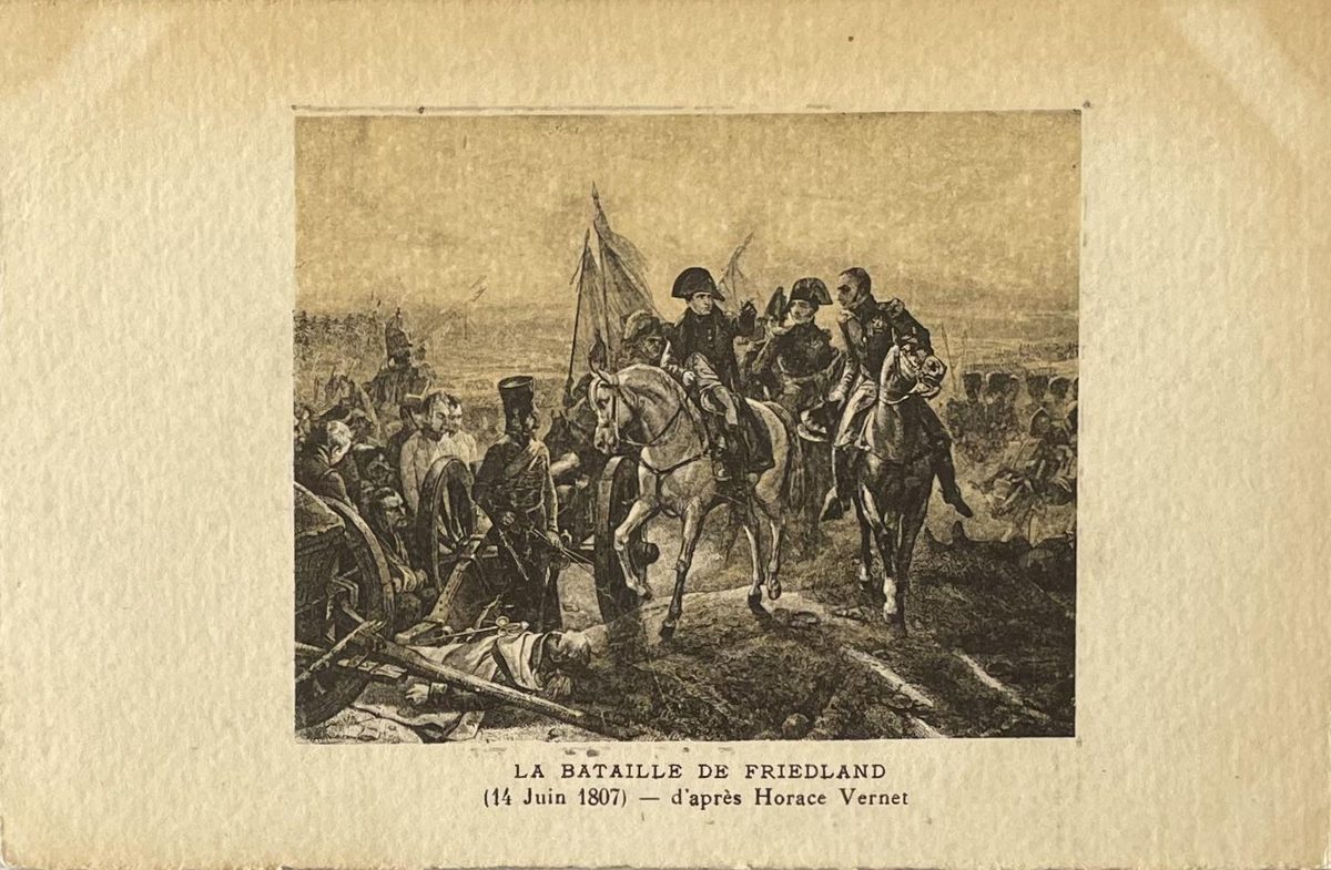"La Batalla de Friedland" por el pintor Horace Vente, muestra el momento de la victoria de Napoleón en Friedland que le ayudo a consolidar su poder como emperador en Europa. Color: sepia, medidas: 9x14cm