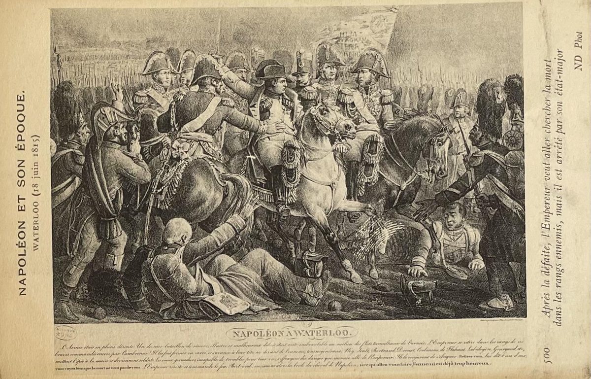 Waterloo YearAño 1911 PlaceLugar Francia ↗ LanguageIdioma French Francés Pintura representativa de la Napoleón en la batalla de Waterloo el 18 de junio de 1815. Color: sepia, medidas: 9x14cm Napoleón, EjércitoMiliciaGuerraWaterlooHistoriaPintura Dominant colourColor dominante ← Back to collection← Volver a la colección View on map →Ver en el mapa →